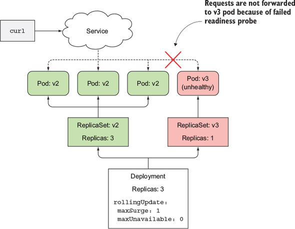As a result, the pod is removed as an endpoint from the service. By the time you start hitting the service in the curl loop, the pod has already been marked as not ready. This explains why you never hit the new pod with curl. And that’s exactly what you want, because you don’t want clients to hit a pod that’s not functioning properly.